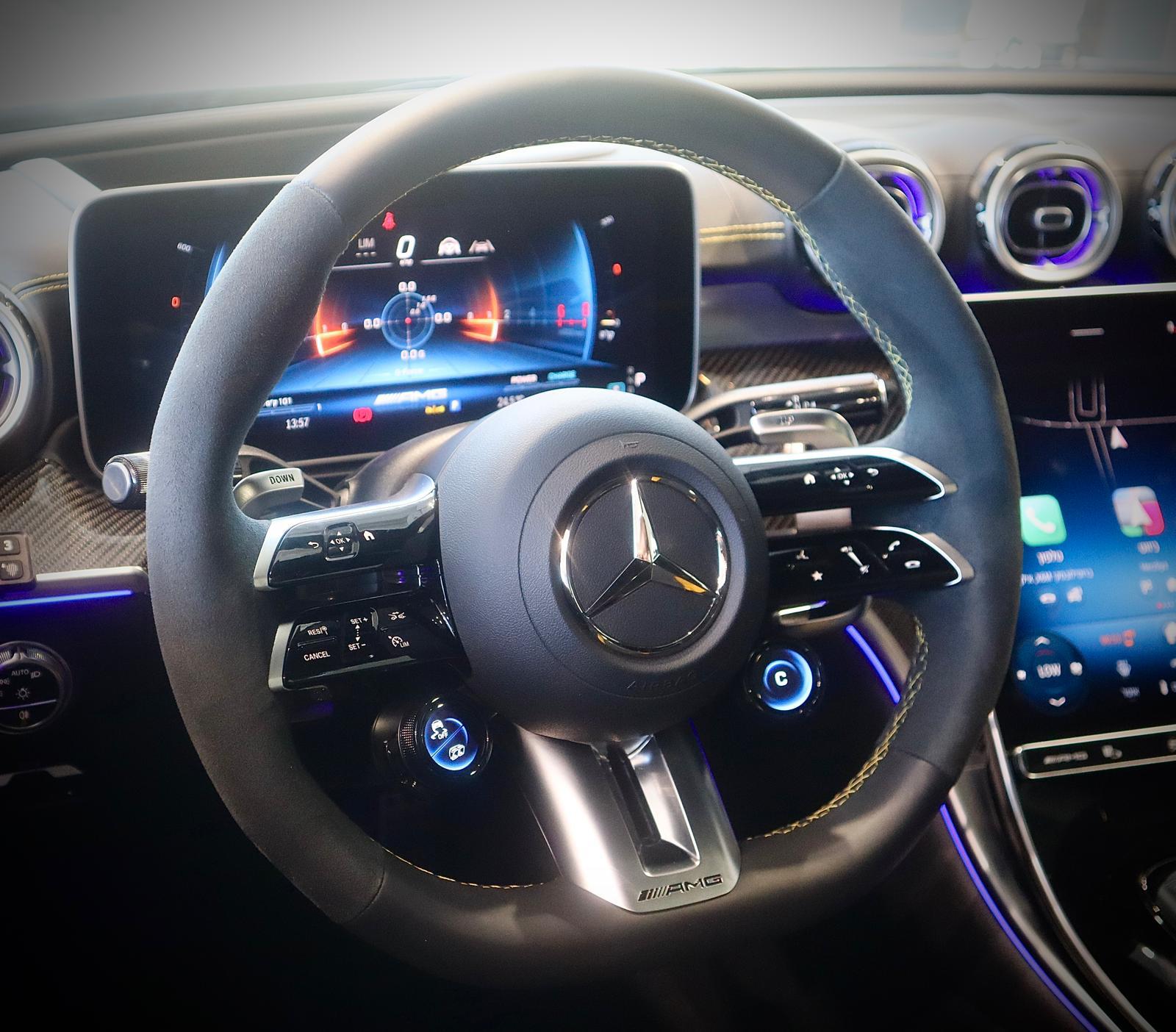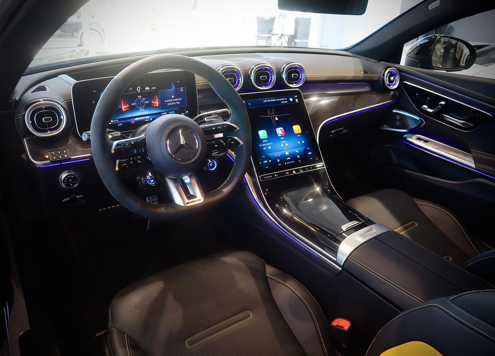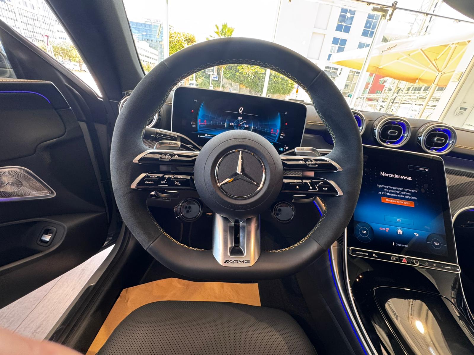 הגה סופר ספורט של AMG מעור משולב אלקנטרה עם כפתורי הפעלה אלקטרונית של האגזוזים,מתלים,דינמיקה מוטורית ועוד