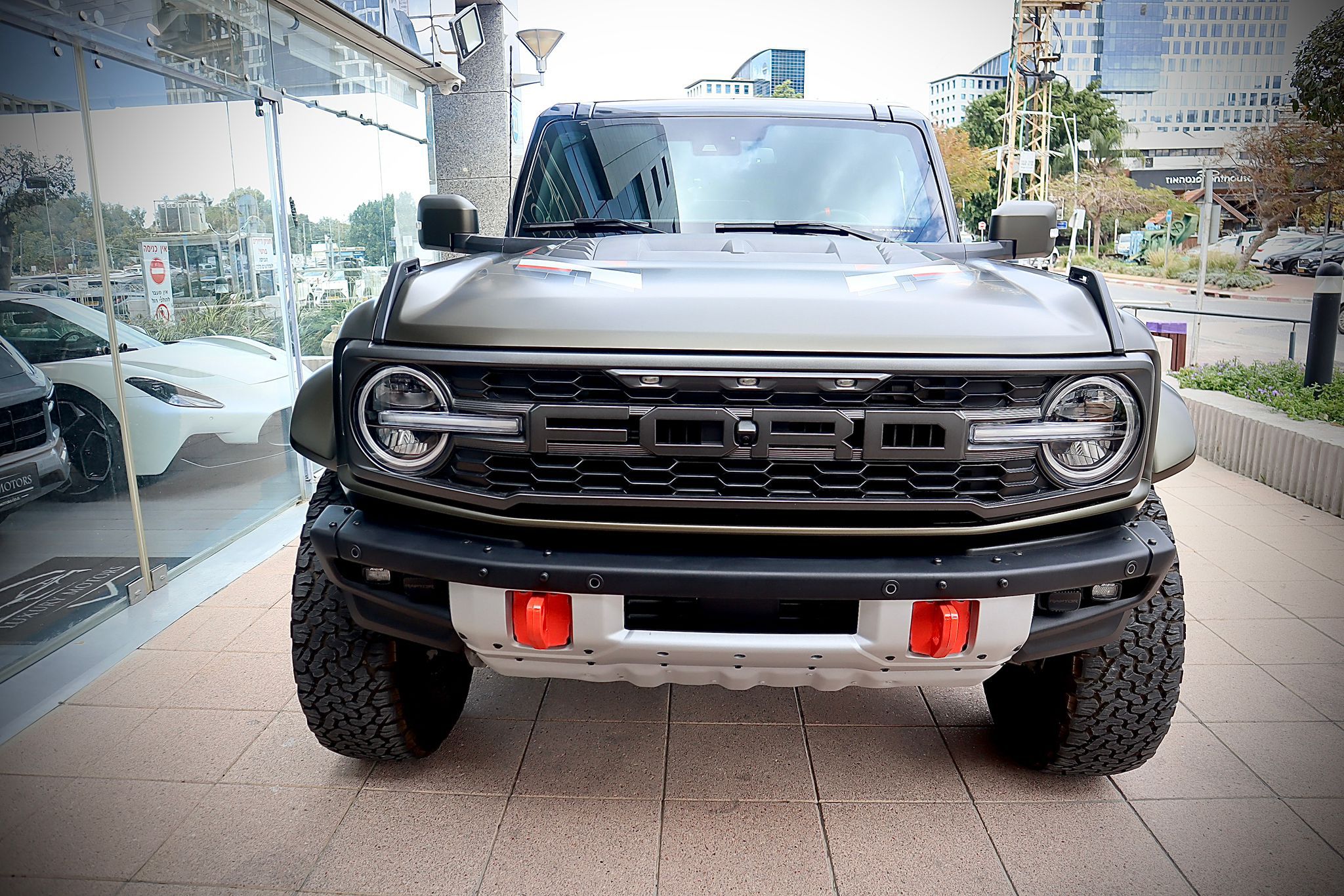 • מכסה מנוע ייחודי של Raptor, גריל עם כיתוב “FORD”.