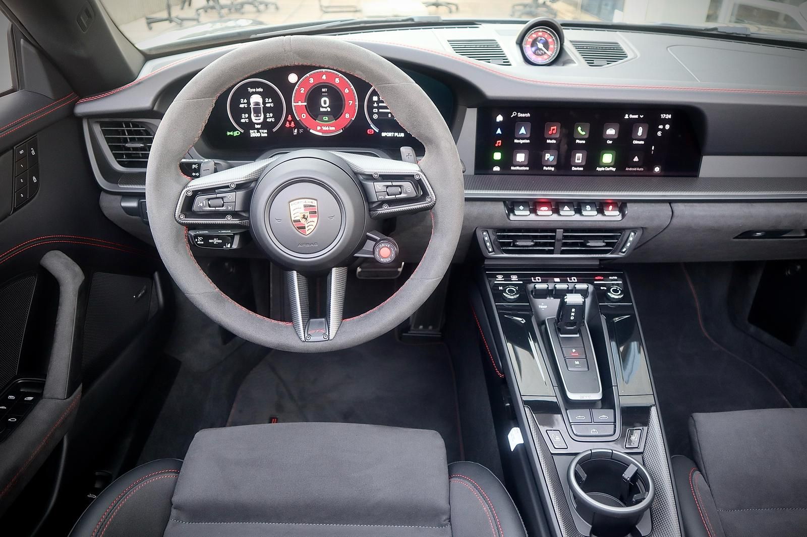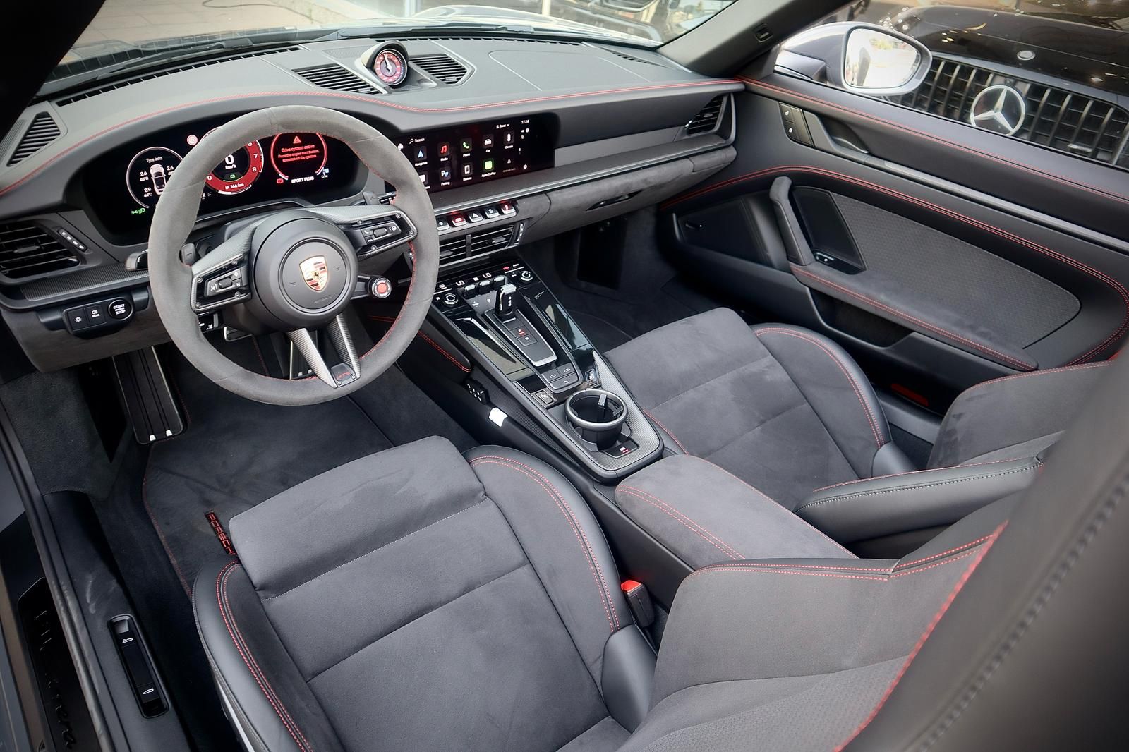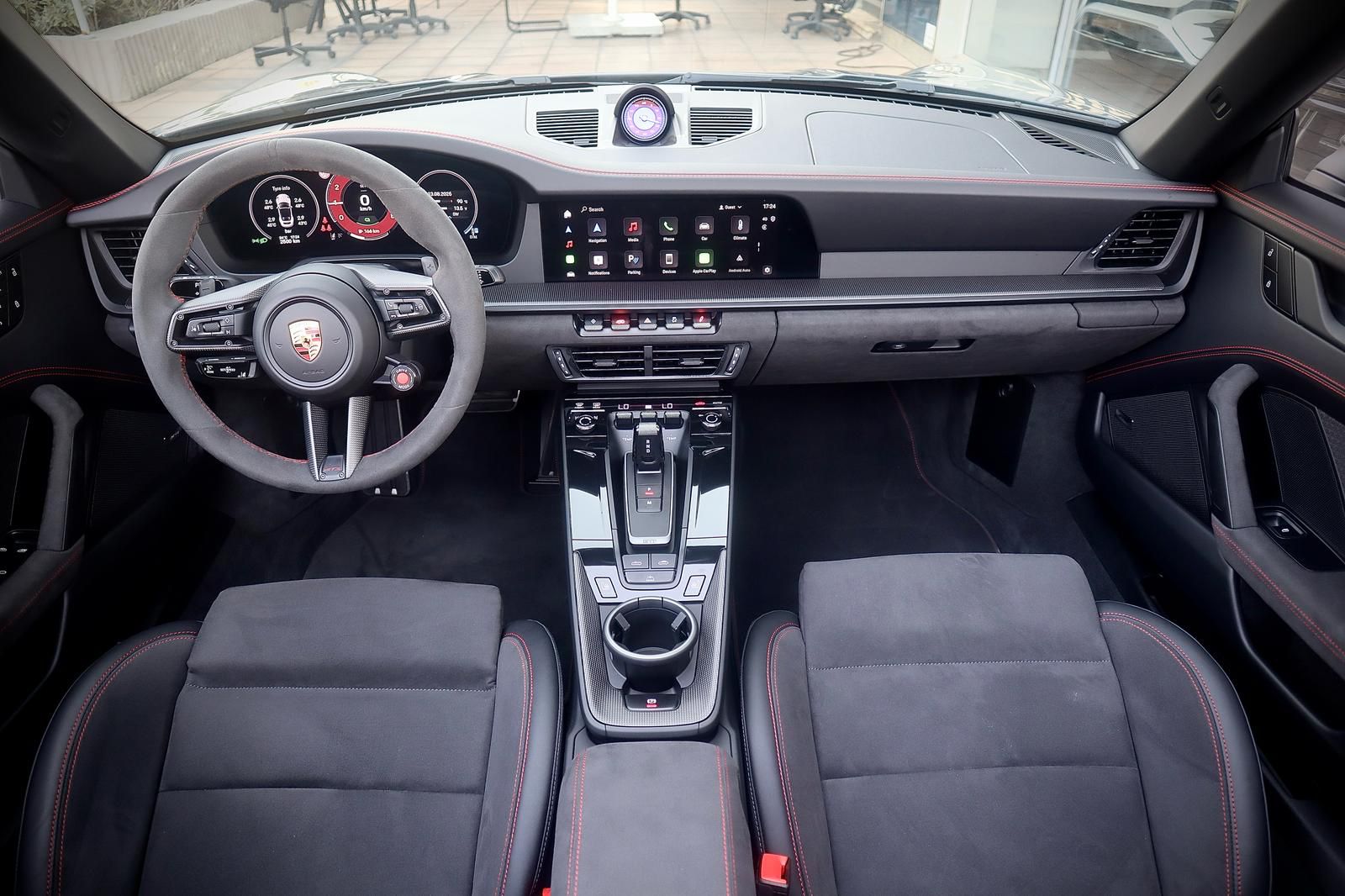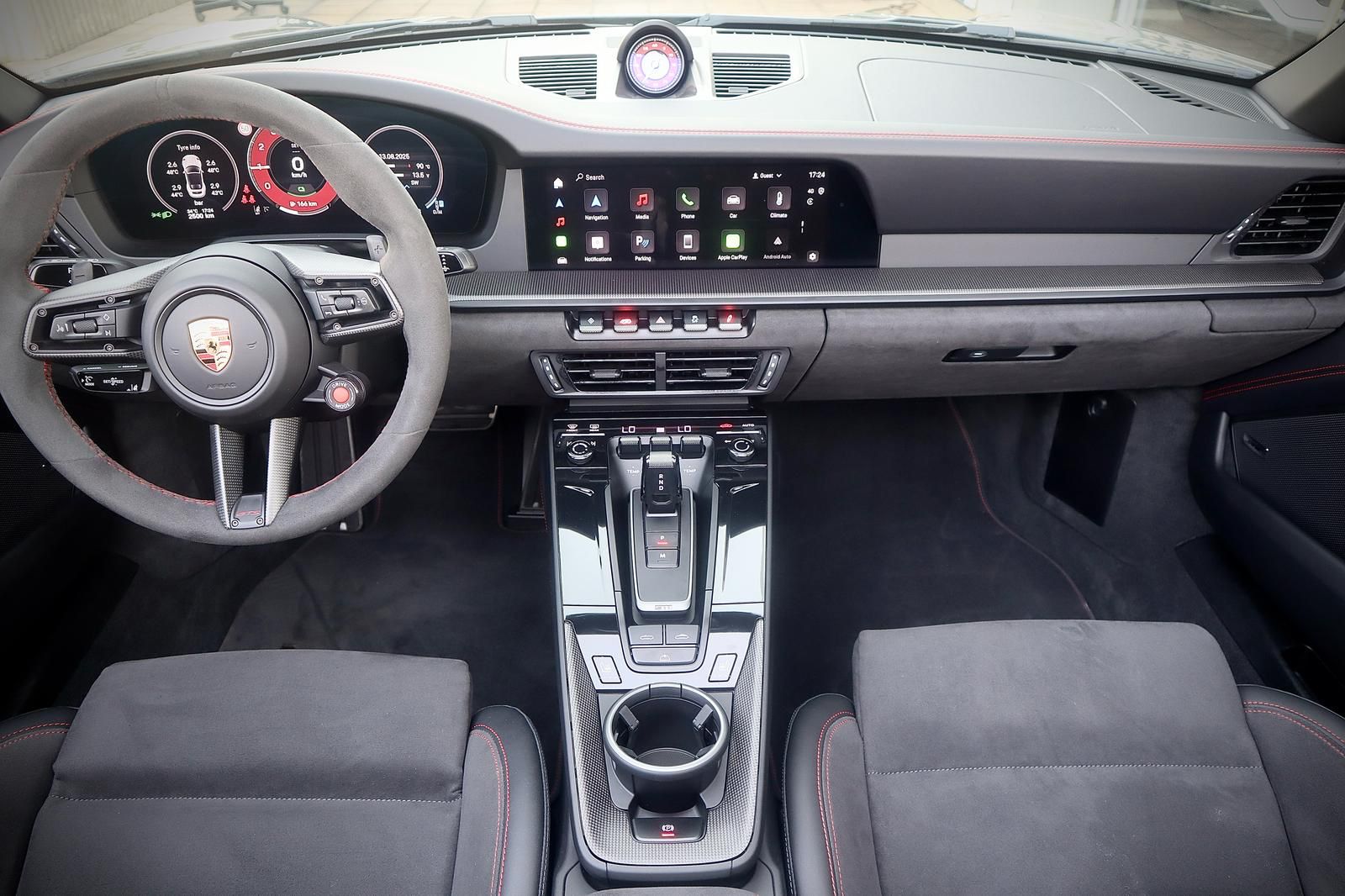 פנים עור מלא בצבע שחור בגימור GTS עם תפרים וכיתוב אדום,כולל ציפוי עור בלוח השעונים והדלתות.