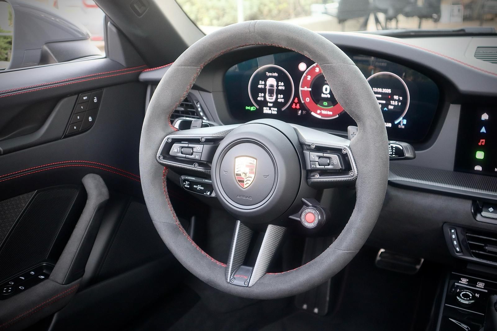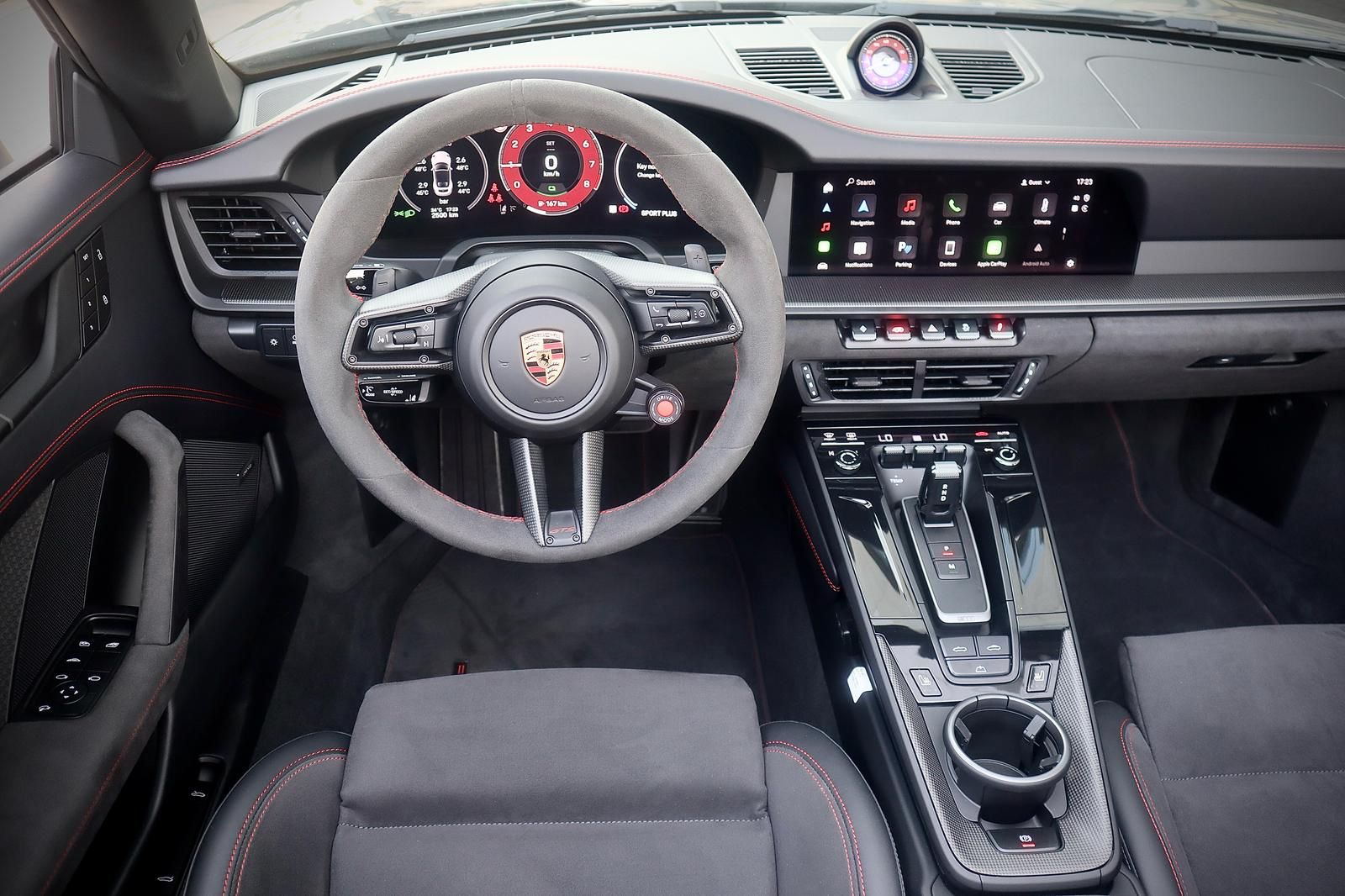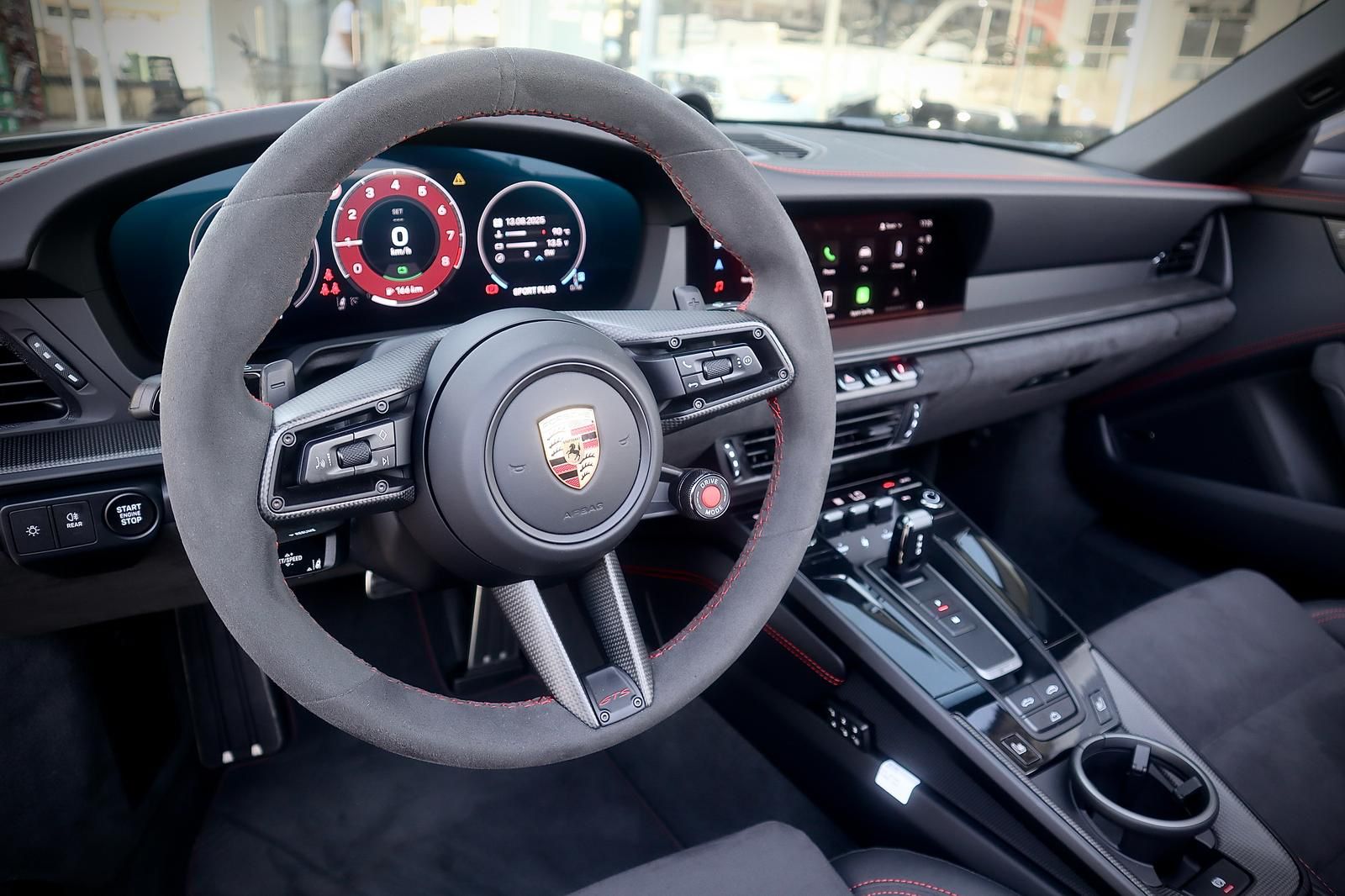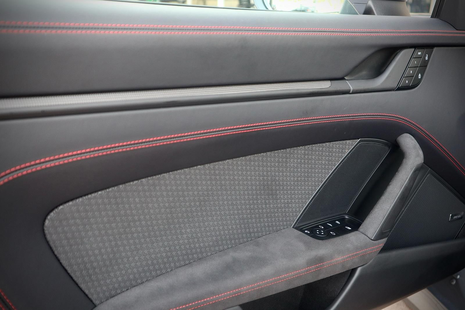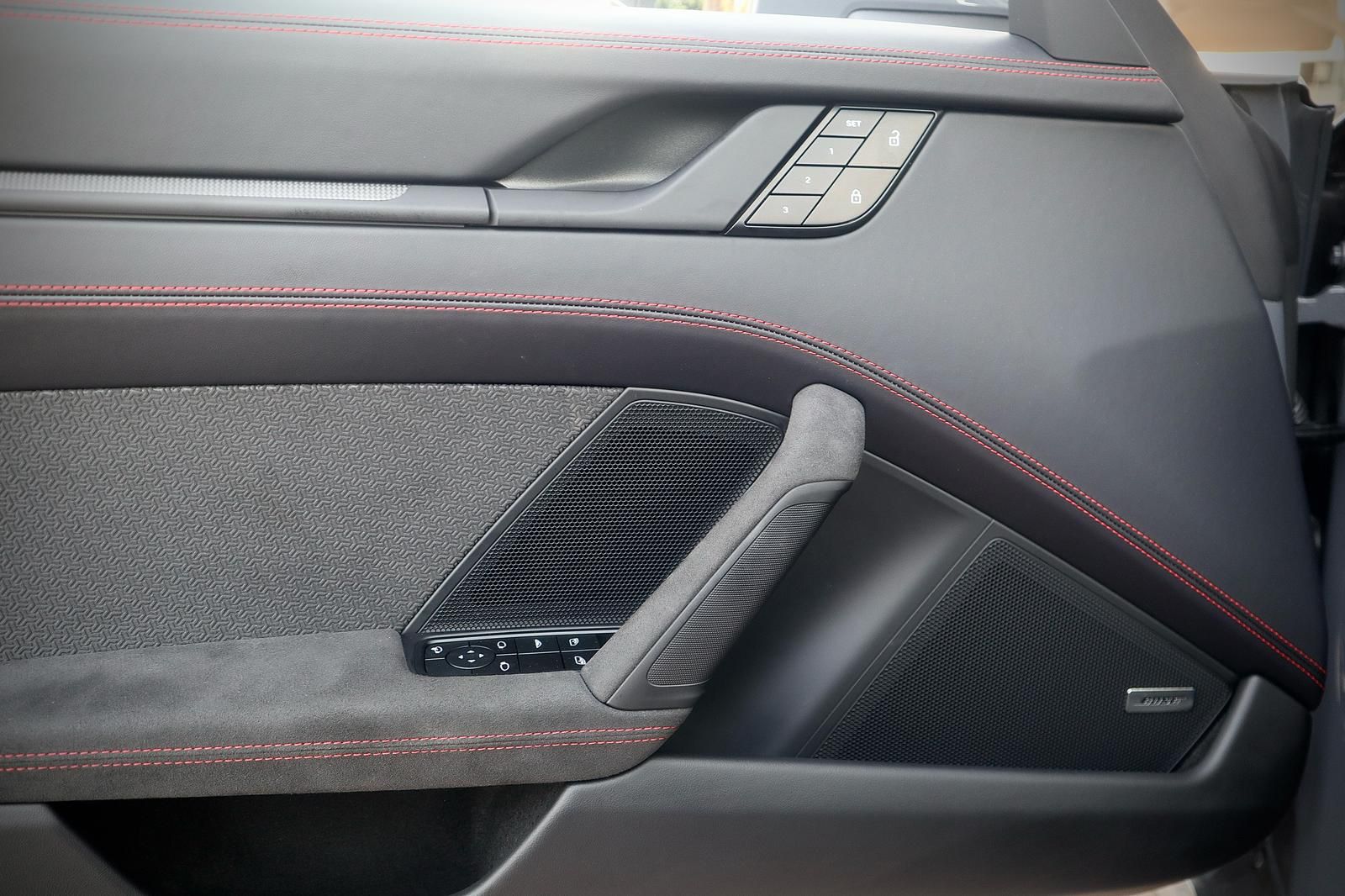 פנים עור מלא בצבע שחור בגימור GTS עם תפרים וכיתוב אדום,כולל ציפוי עור בלוח השעונים והדלתות.